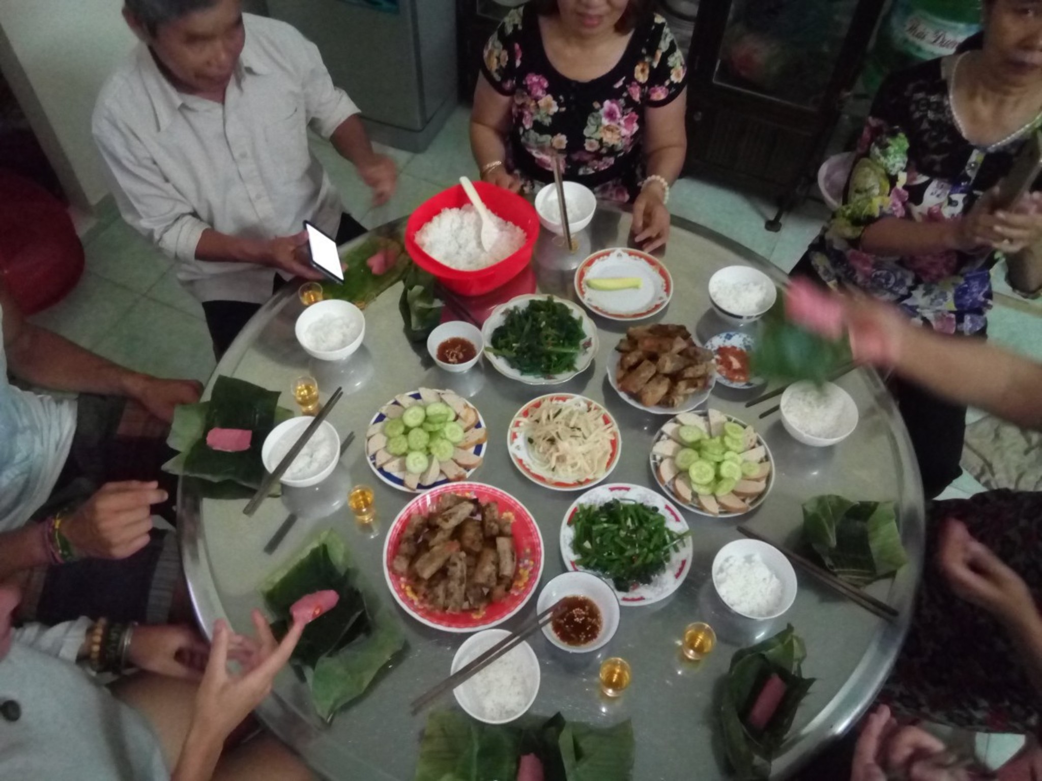 Back in the house of our hosts, the house already smelled of food. His wife Nhu allowed me to help her roll the spring rolls. In the early evening a couple from France and Hien’s sister as well as his niece arrived. Before we were allowed to change from couch to the dinner table, we had to empty his bottle of home made rice wine. It was delicious, but we were pretty much drunk afterwards. In the end we were eight people enjoying an excellent dinner. I’ve never seen such great hospitality. Thank you very much Nhu and Hien!