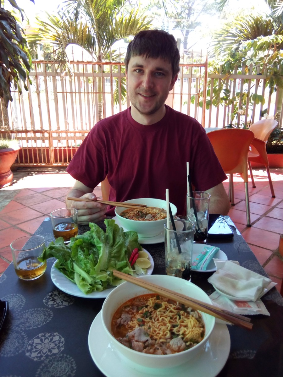 At about ten o’clock we stopped for a coffee in Dak Mil. Ste found a very nice Ca Phe called San Vuon. This coffee bar wasn’t directly next to the road like the rest of the Ca Phe’s are. They even had chairs in normal size - not child sized, as usual in Vietnam. We decided after the excellent coffee to ask whether it’s possible to eat something. And again we witnessed incredible hospitality. Via google translate the charming lady from the bar asked us, if shrimp noodles will be okay. Of course she got our okay for such a nice suggestion! Half a minute later she left the bar to return with a bag filled with noodles, vegetables and other food. In less than ten minutes she cooked a delicious shrimp and beef soup, refilled our glasses again and again with green tea and brought us different fruits to taste afterwards. Jackfruit and custard apple were both absolutely delicious.