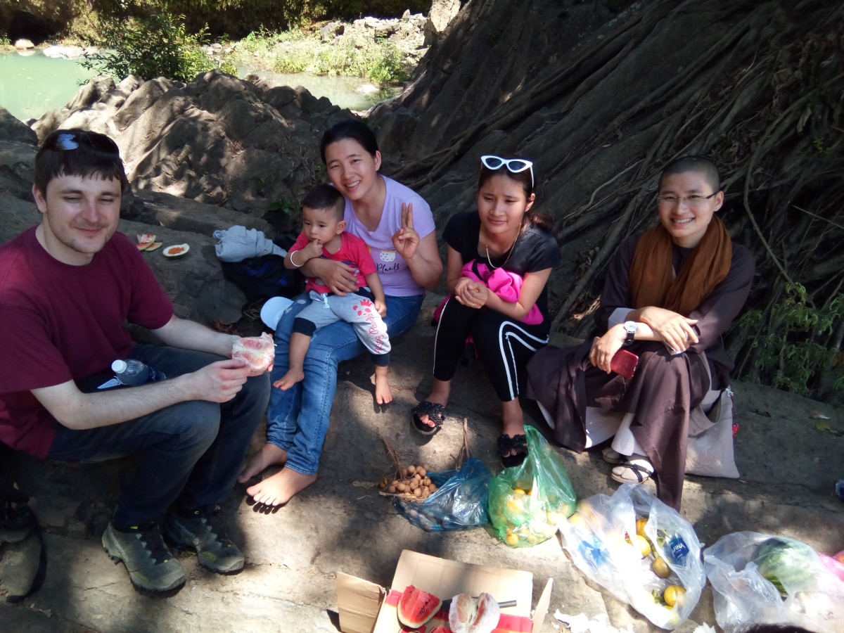 Freshly strengthened we headed to the Dray Nur Waterfall. Because of the missing water it was certainly nothing special. Wondering how my picture of the waterfall had become, Tiên Mai, a young monk, came over to talk to us. She spoke some pretty good English and invited us to join her and her family, sitting a few meters away from us. They were all very kind, offered us water and different fruits (watermelon, longan, pomelo and the very bitter Vietnamese cashew).
