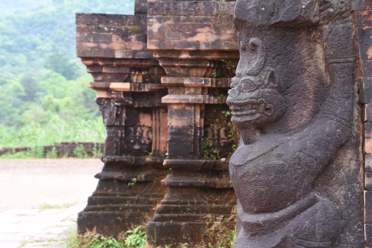 Although we decided to keep off touristic places we wanted to visit the ruins of My Son. These temples from the Cham-Dynasty were built between 4th and 11th century and nowadays famous for their beautiful Hindu sculptures. During the American War Vietcong tried to hide in the valley of My Son. US airplanes bombed and destroyed most of the temples in the late 1960s. Since 1999 My Son is part of the UNESCO world heritage and they try to restore it. We started early in the morning and arrived at about half past eight as some of the first visitors. Good decision. When we left the parking was already full of buses and cars.