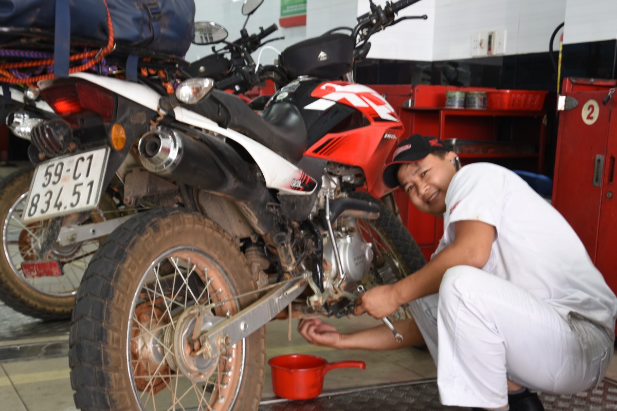 Tigit (the company we hired our motorbikes from) told us to make an oil change every 1000 km. In fact we drove already 1100 km so we had to find a Honda dealer. We are not allowed to make the oil change in a small backyard workshop. All these motorbikes in Vietnam don’t have oil filters, so everybody needs to change oil very frequently. I actually don’t want to know what happens with the oil. The Change costs about five CHF each, oil including.